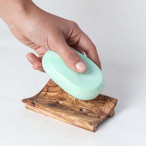 จานสบู่ทำจากไม้มะกอกธรรมชาติเป็นมิตรกับสิ่งแวดล้อมทำด้วยมือมีเอกลักษณ์ที่วางสบู่ที่ทำจากไม้มะกอกพร้อมช่องระบายน้ำที่วางสบู่ในห้องน้ำ